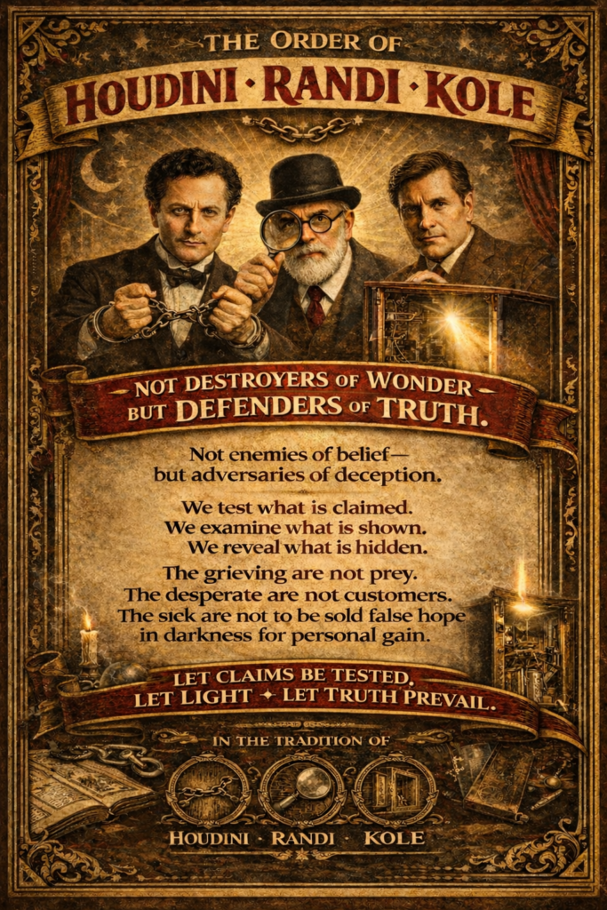The Houdini Mandate, from his book (Chapter 15), States that Magicians are to always protect the public from (Swindlers, such as Spiritualist claiming to have supernatural powers in-order to steal money from vulnerable people; this would include: Astrologists, Psychics, Palm readers, Fortune tellers, Potion Peddlers, Snake-oil healers, and Crystal Healing Talismans-or pretty crystal rock nonsense, etc.) This is Simon the Sorcerer, Dr. Burke, and Dr. Brinkley scam type of stuff, Just look; and follow the trail of cash money that charlatans steal by deceiving people. Harry Houdini, a (Stunt/Magician), James Rand,i a (Scientist), and Andre Kole, a (Gospel Magician, and teacher of Magicians), like David Copperfield, All made this apart of their personal life goal to serve us all by exposing fraud. Not by destroying, (belief, wonder, mystery, excitement, and enjoyment!)
